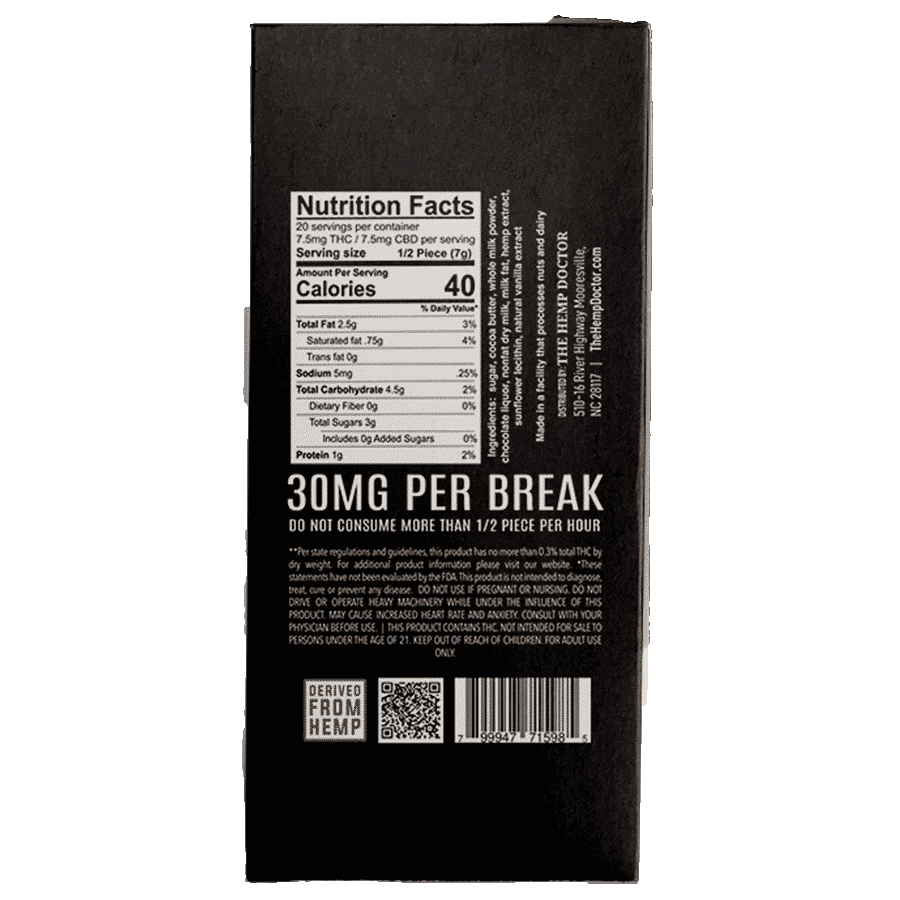 At The Hemp Doctor, we prioritize your experience, which is why we make sure all our products are free from harmful additives or substances. Our mouth-watering CBD:D9 THC Chocolate Bars are crafted from the highest quality ingredients on the market, with each bite offering an unforgettable sensory experience while providing the full benefits of our hemp-derived D9 infusion.